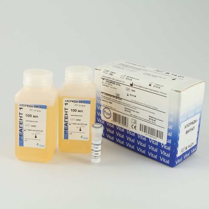 Диагностический набор ХЛОРИДЫ-ВИТАЛ (В 14.01) для количественного определения содержания хлоридов в сыворотке (плазме) крови и моче колориметрическим методом.