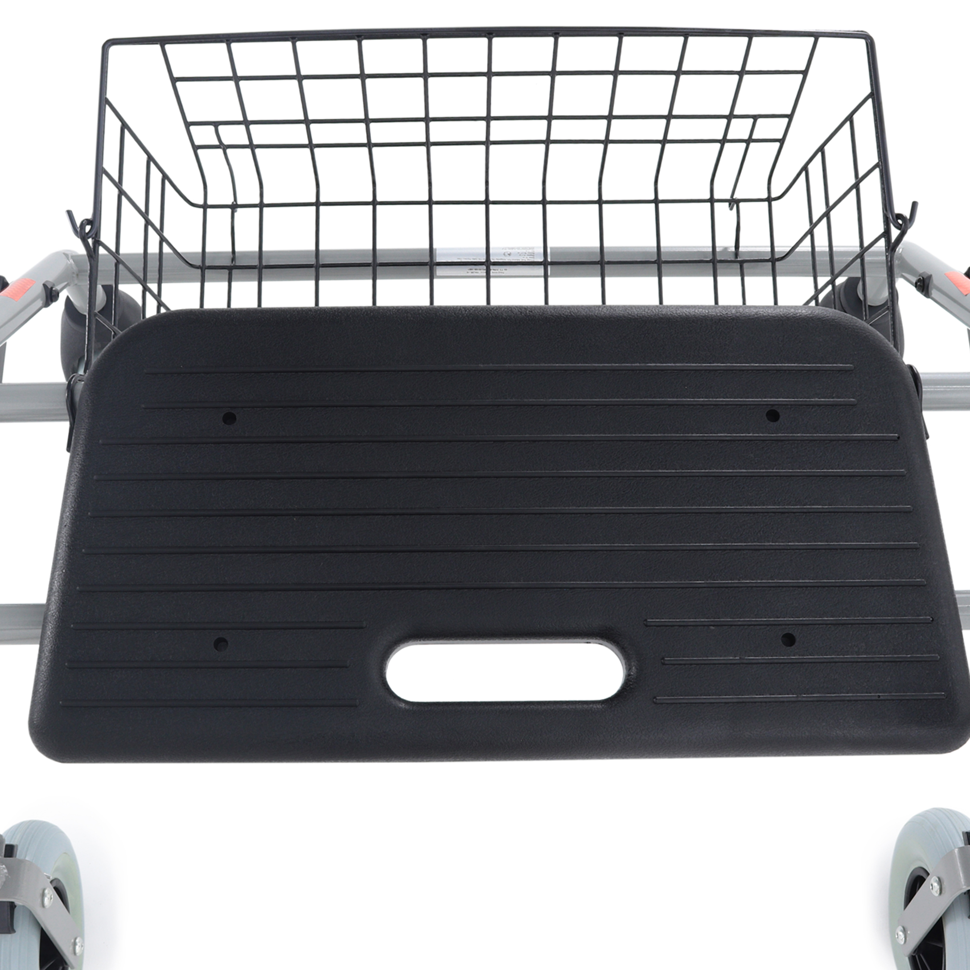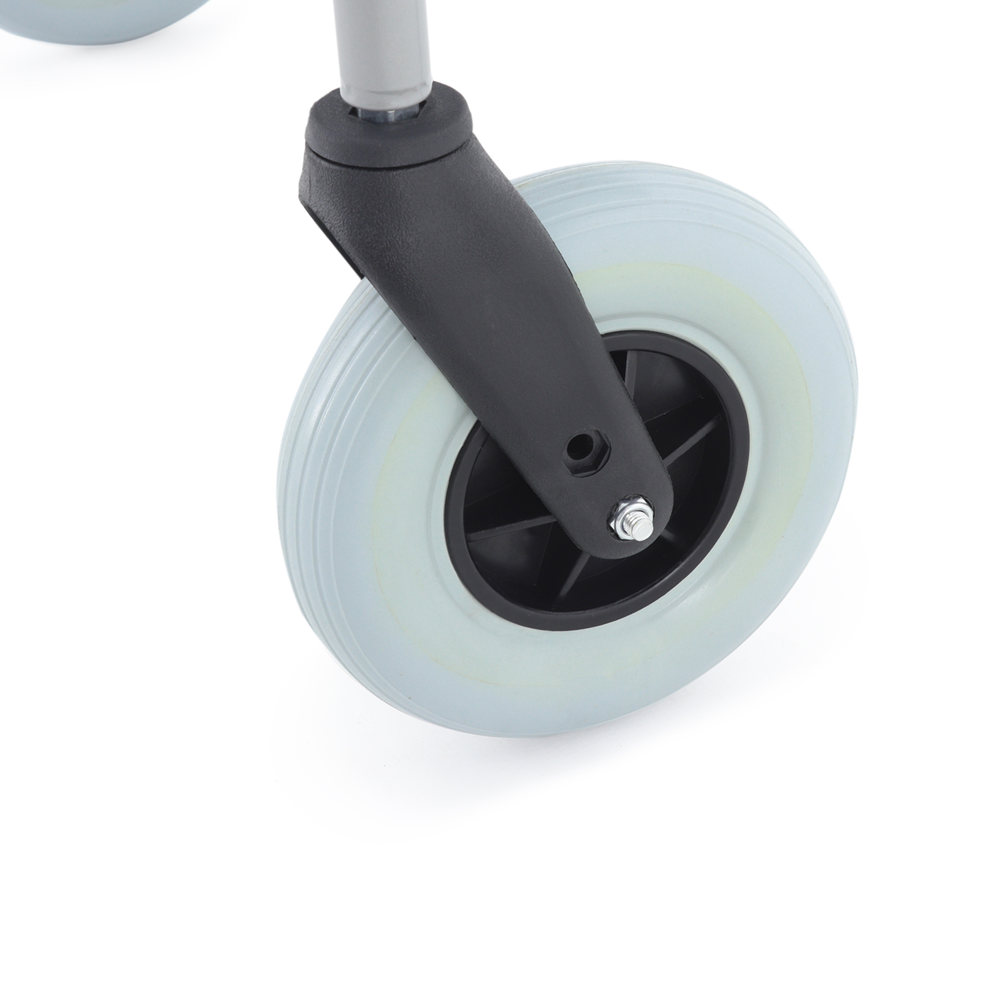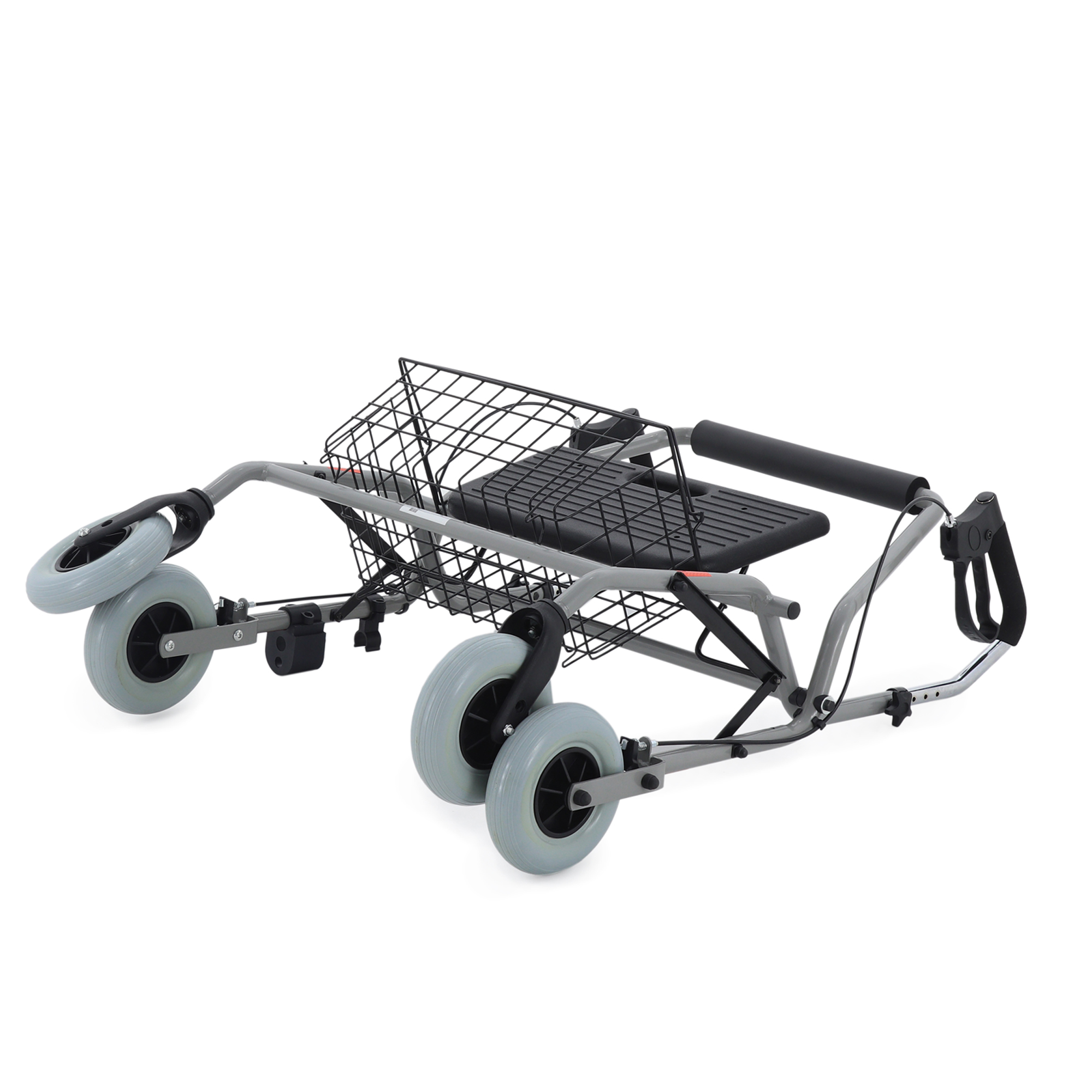 Четыре колеса (_ 195x47 мм) на подшипниках с полиуретановыми шинами включают полноповоротные передние колёса (угол наклона вилки 22°) для манёвренности. Для устойчивости расстояние между задними колёсами (70,5 см) больше, чем между передними (61 см). Сетчатая корзина (49x26,5x22 см, грузоподъёмность 10 кг), съёмный поднос (39,1x25,5x3,3 см) и комплект для трости повышают функциональность. Четыре светоотражающие наклейки обеспечивают безопасность в тёмное время. Габариты (81x62x84–92 см) и масса (12,8 кг) гарантируют удобство, а все поверхности устойчивы к дезинфекции.
