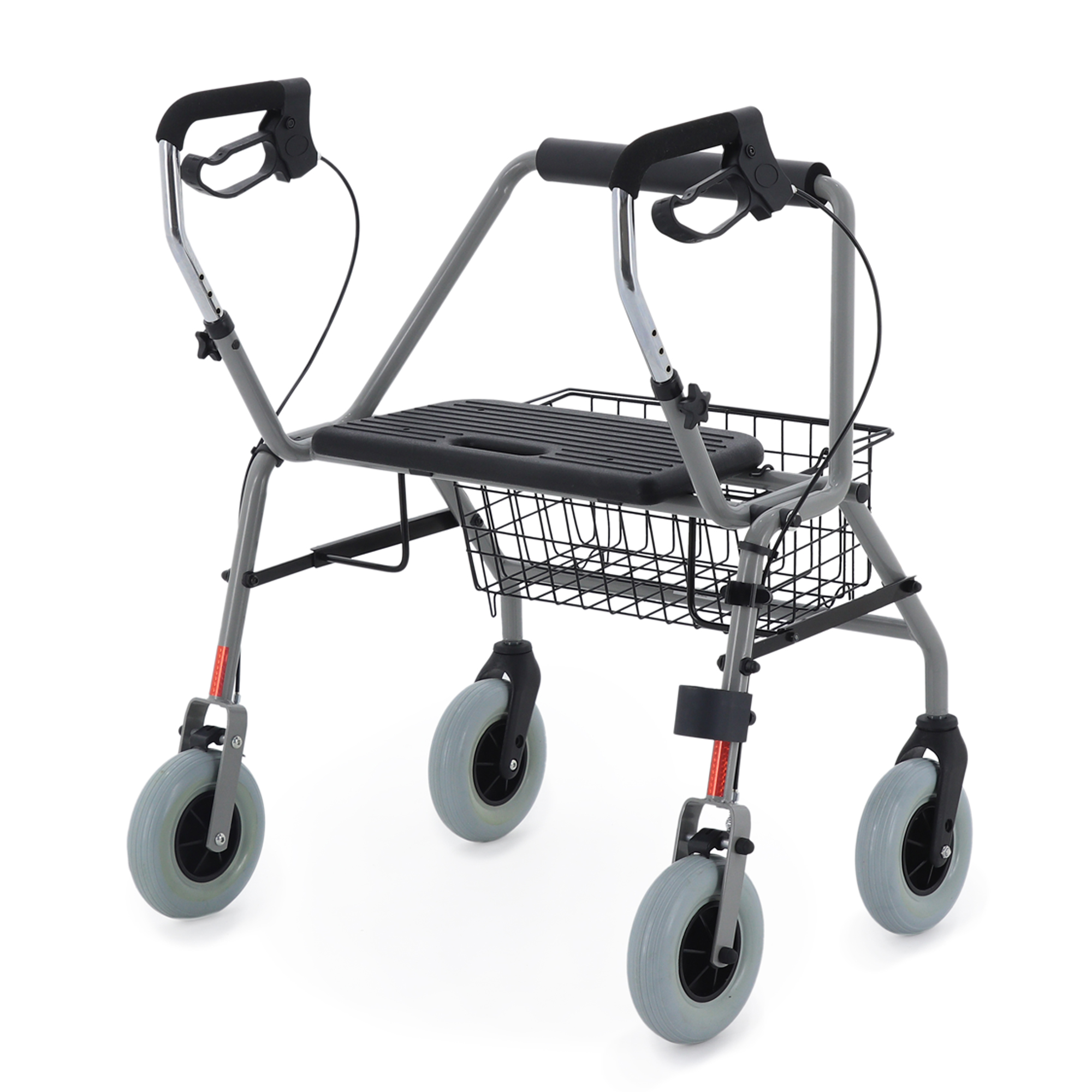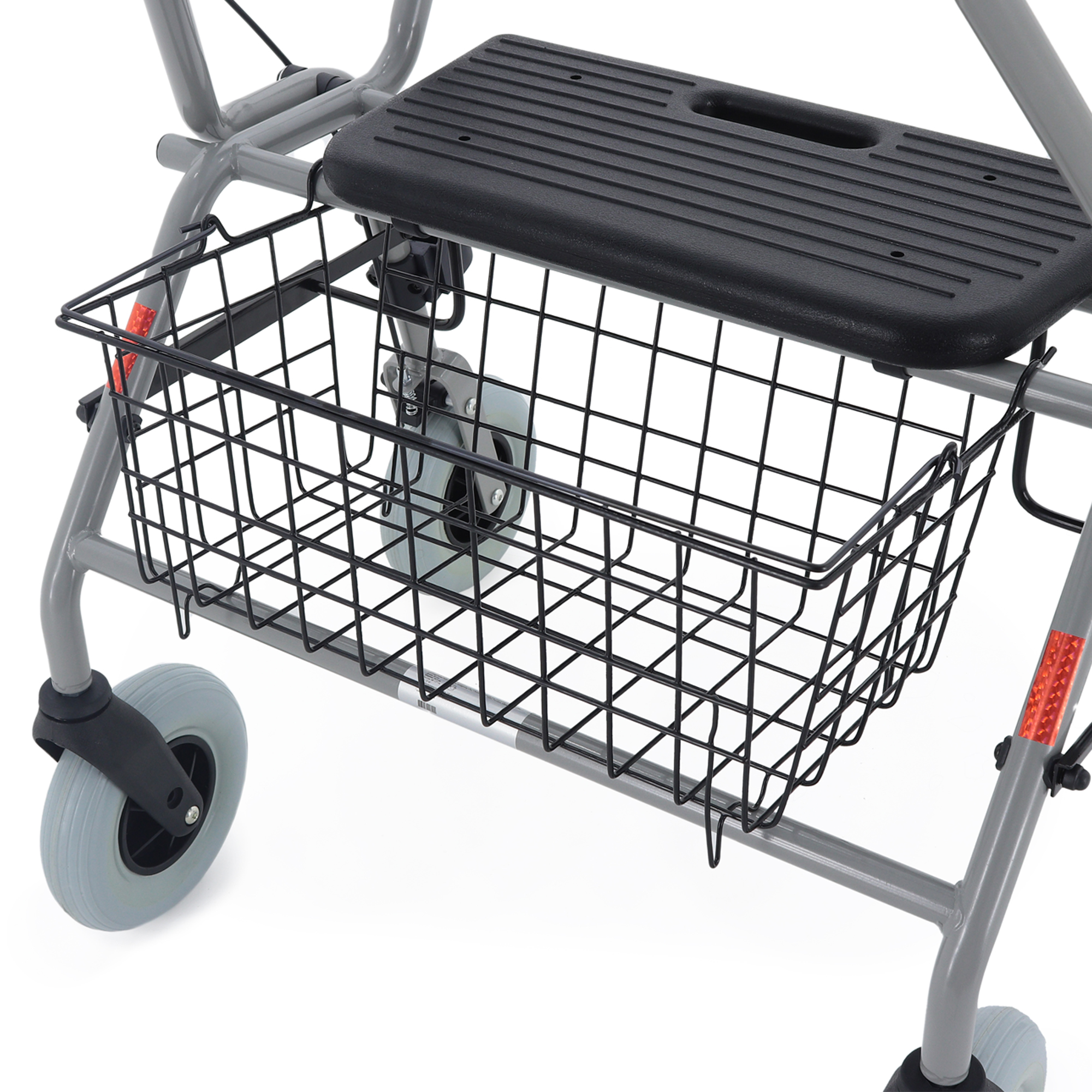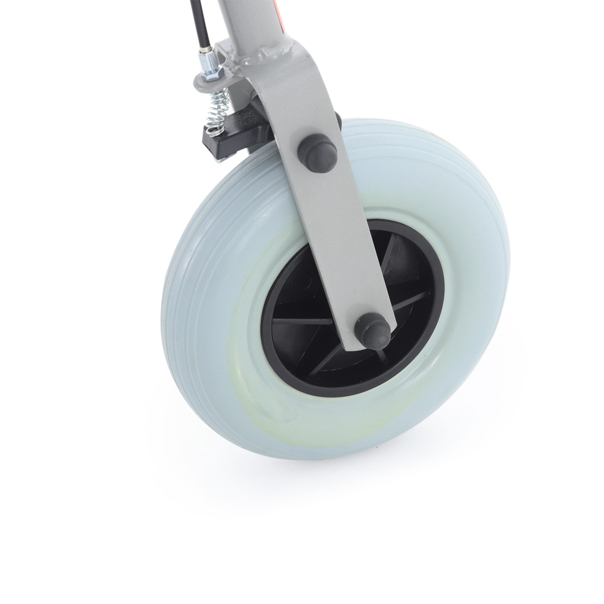 Четыре колеса (_ 195x47 мм) на подшипниках с полиуретановыми шинами включают полноповоротные передние колёса (угол наклона вилки 22°) для манёвренности. Для устойчивости расстояние между задними колёсами (70,5 см) больше, чем между передними (61 см). Сетчатая корзина (49x26,5x22 см, грузоподъёмность 10 кг), съёмный поднос (39,1x25,5x3,3 см) и комплект для трости повышают функциональность. Четыре светоотражающие наклейки обеспечивают безопасность в тёмное время. Габариты (81x62x84–92 см) и масса (12,8 кг) гарантируют удобство, а все поверхности устойчивы к дезинфекции.