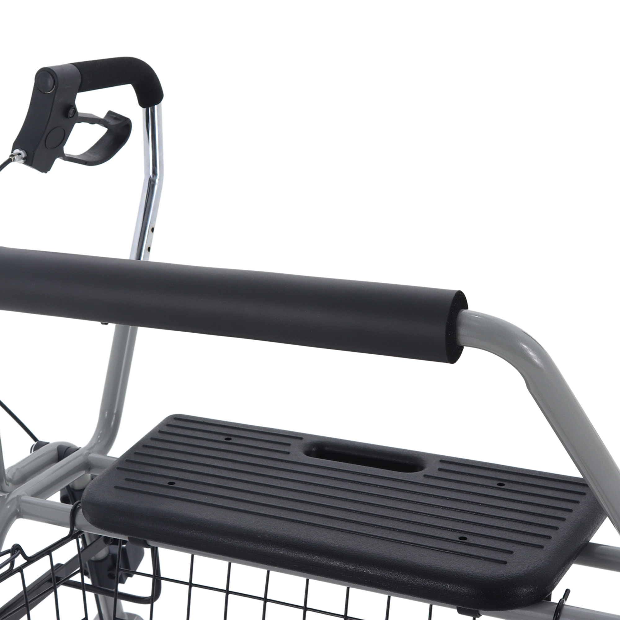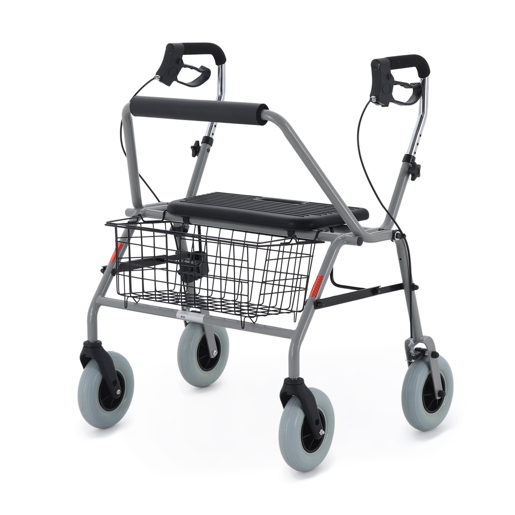 Роллаторы оснащены выдвижными рукоятями (_ 22 мм) с регулировкой высоты (84–92 см, 5 положений, шаг 2 см), полиуретановыми наконечниками (_ 3x19 см) и пластиковыми ручками тормозов с функцией торможения (вверх) и стояночного тормоза (вниз). Сиденье из высокопрочного пластика с полиуретановым покрытием (24,5x48 см, высота 55 см) предназначено для отдыха, с четырьмя отверстиями для фиксации подноса. Опора для спины с мягкой накладкой (37,5 см, _ 2,5/4,8 см) обеспечивает комфорт.