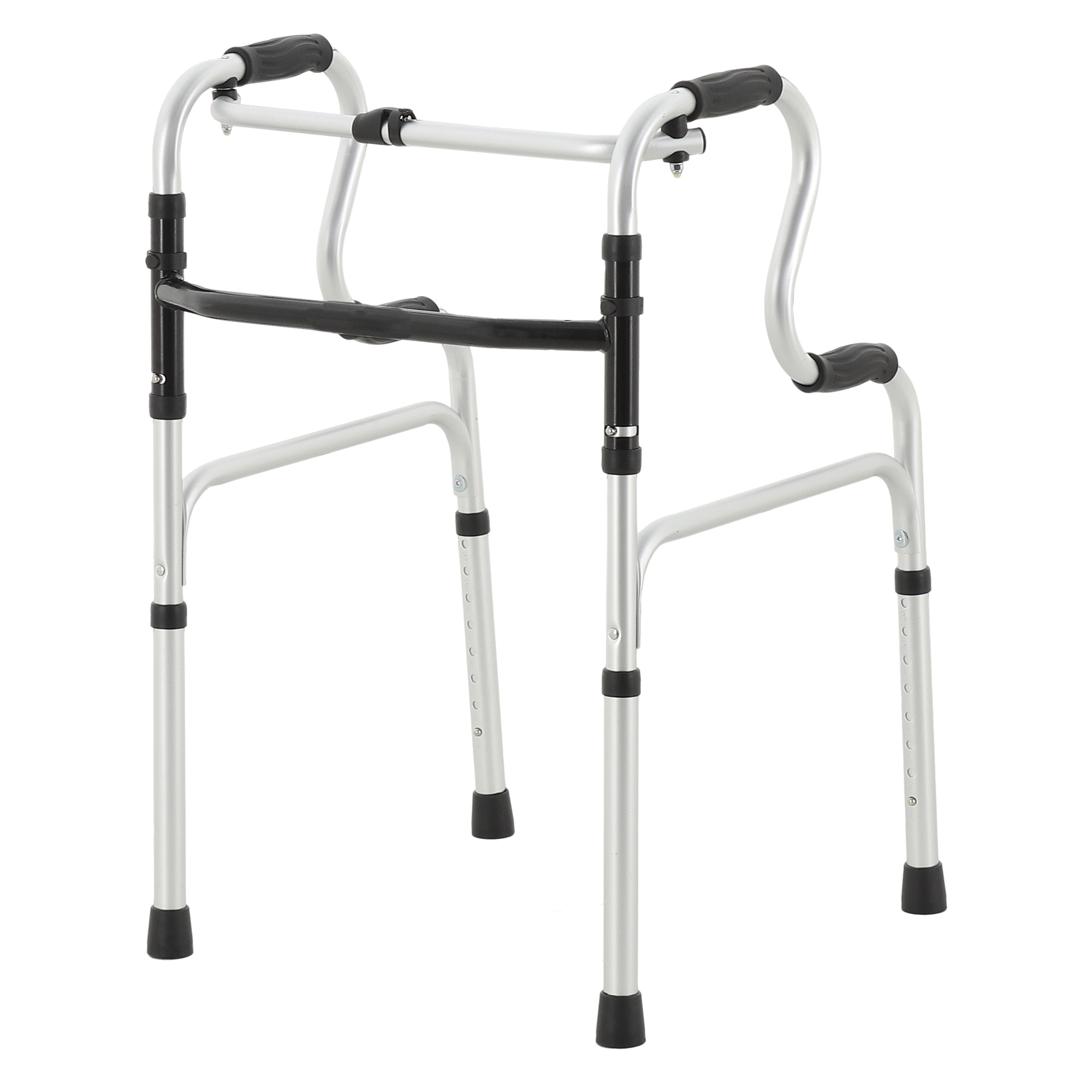 Рамы оснащены телескопическими выдвижными ножками (_ 28 мм) с регулировкой высоты (77–94,5 см, 8 положений, шаг 25 мм) и двумя парами резиновых ручек (_ 36x115 мм) на разных уровнях (верхняя: 77–94,5 см, нижняя: 52–69,5 см). Ножки имеют съёмные наконечники из нескользящей резины с металлической шайбой. Складывание осуществляется через механизм на верхней связи, обеспечивая компактность (76,5x52,5x10 см или 71,5x52,5x10 см без ножек). Все телескопические соединения защищены пластиковыми втулками. Габариты (52x49–51x77–94,5 см), масса (2,6 кг) и поверхности, устойчивые к дезинфекции, делают ходунки удобными для использования.