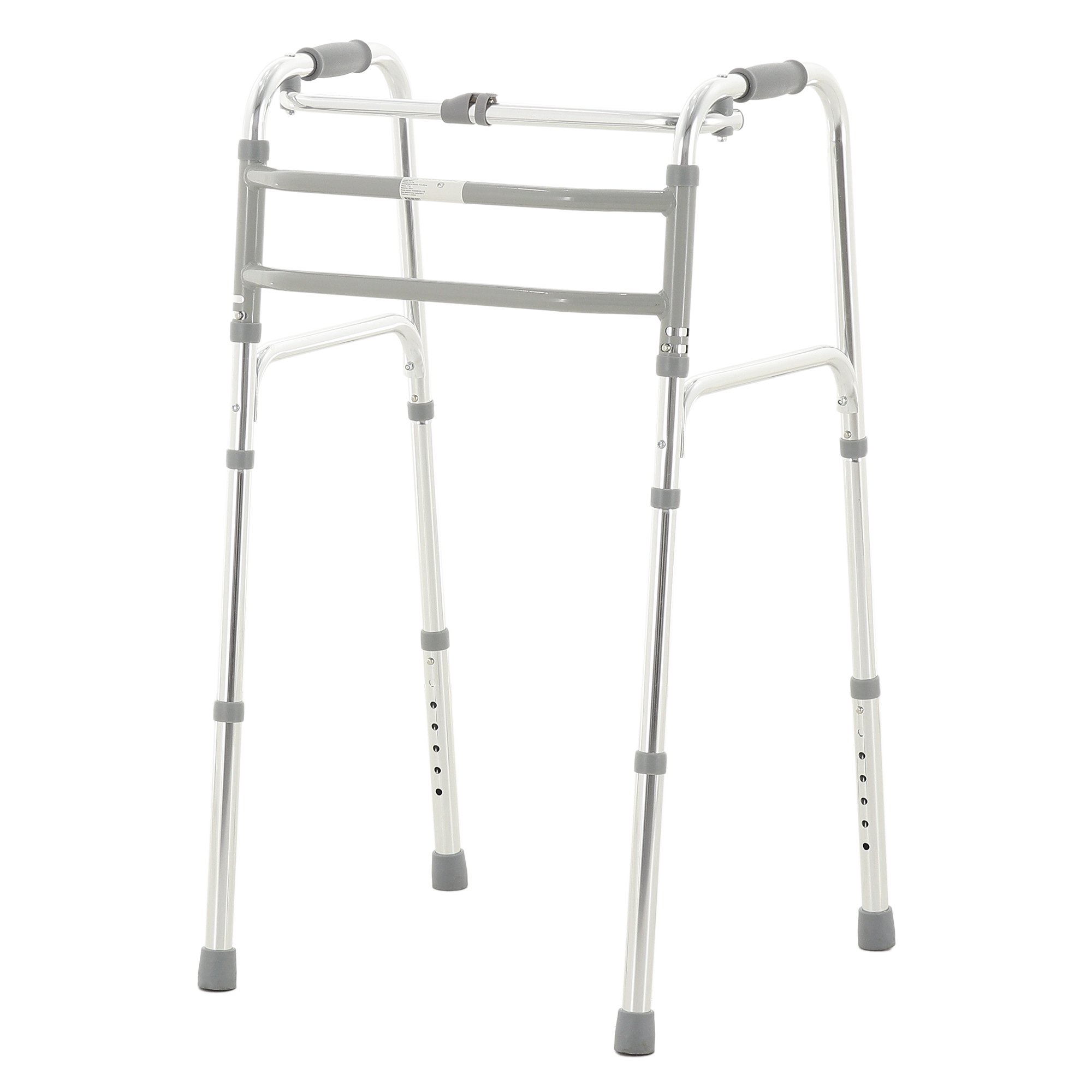 Рамы оснащены телескопическими быстросъёмными ножками (_ 27,5 мм) с регулировкой высоты (80,5–95,5 см, 7 положений, шаг 2,5 см) и опорными ручками из вспененного полиуретана (_ 35–38x110 мм). Ножки имеют съёмные наконечники из нескользящей термопластичной резины с металлической шайбой. Складывание осуществляется через механизм на верхней связи, обеспечивая компактность (82,5x51,5x9,5 см или 72,5x51x10 см без ножек). Все телескопические соединения защищены пластиковыми втулками. Габариты (51,5–58x44,5–47x80,5–95,5 см), масса (2,4–3,7 кг) и поверхности, устойчивые к дезинфекции, делают ходунки удобными для использования.