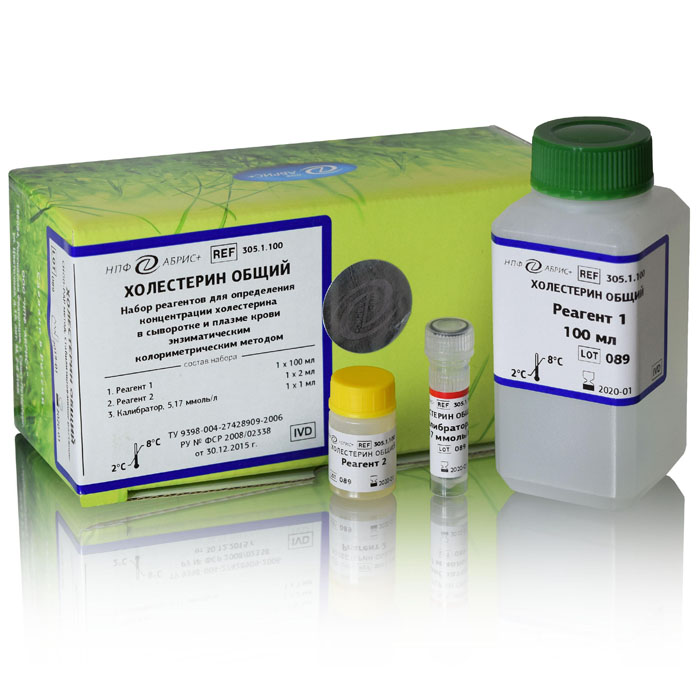 Набор реагентов для определения концентрации общего холестерина в сыворотке и плазме крови энзиматическим колориметрическим методом.