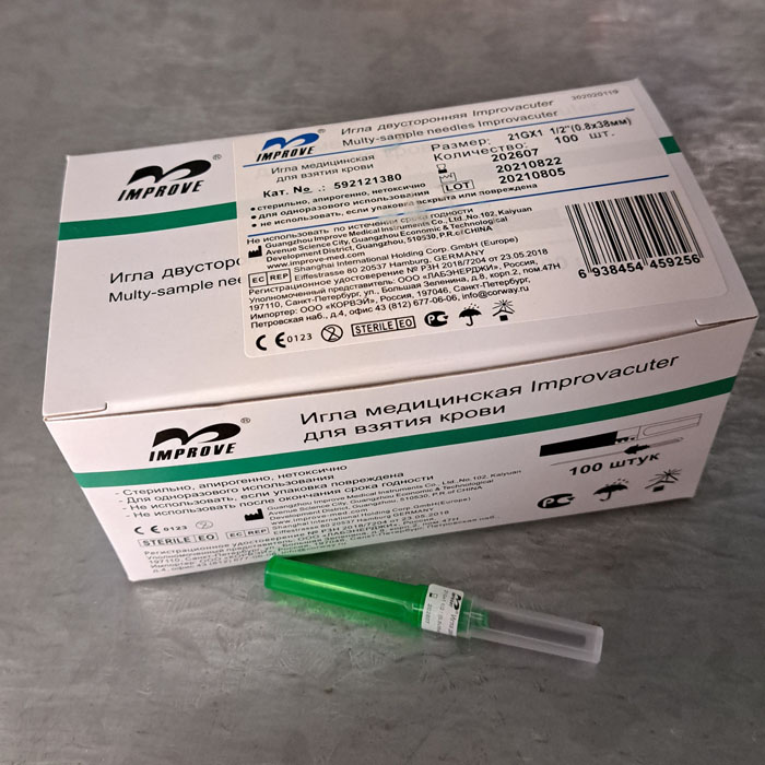 Двусторонняя игла к вакуумным пробиркам IMPROVACUTER обеспечивает закрытость системы, при которой кровь попадает в пробирку без контакта с внешней средой. Одна часть иглы предназначена для введения в вену пациента, другая – для прокалывания резиновой части пробки пробирки, закрыта резиновым клапаном, сохраняющим герметичность системы во время смены пробирки.