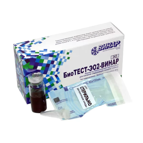 Индикатор биологический «БиоТЕСТ-ЭО2-Винар» представляет собой носитель в виде пластиковой пробирки тира Эппендорф/стеклянного флакона с высушенными спорами бактерий Bacillus atrophaeus ATCC 9372, запакованный в бумажно-плёночную стерилизационную упаковку. Индикатор предназначен для контроля эффективности процесса стерилизации медицинских изделий оксидом этилена.