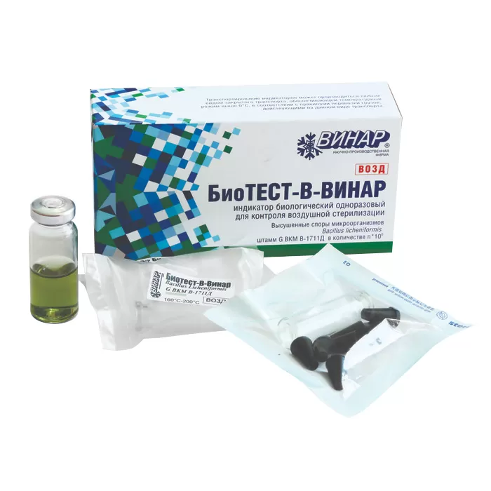 Индикатор биологический «Биотест-В-Винар» представляет собой инокулированный высушенными спорами тест-микроорганизмов носитель в виде инсулинового флакона, запакованный в стерилизационную упаковку из прозрачной полиамидной плёнки.