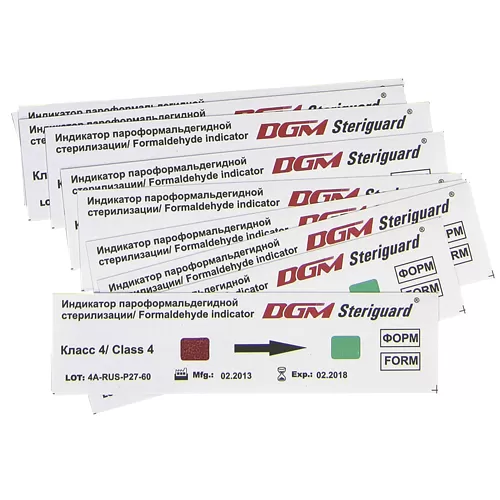 Индикатор химический одноразовый для контроля процесса газовой стерилизации парами формальдегида марки. Индикатор соответствует классу 4 по ГОСТ Р ИСО 11140-1-2009 и предназначен для использования в пароформальдегидных стерилизаторах при размещении внутри каждой стерилизационной упаковки. Каждый отдельный индикатор представляет собой не скрепленные друг с другом полоски, на лицевой стороне которых нанесена индикаторная метка, необратимо меняющая цвет при обеспечении определенных условий воздействия стерилизующего агента в процессе цикла стерилизации.