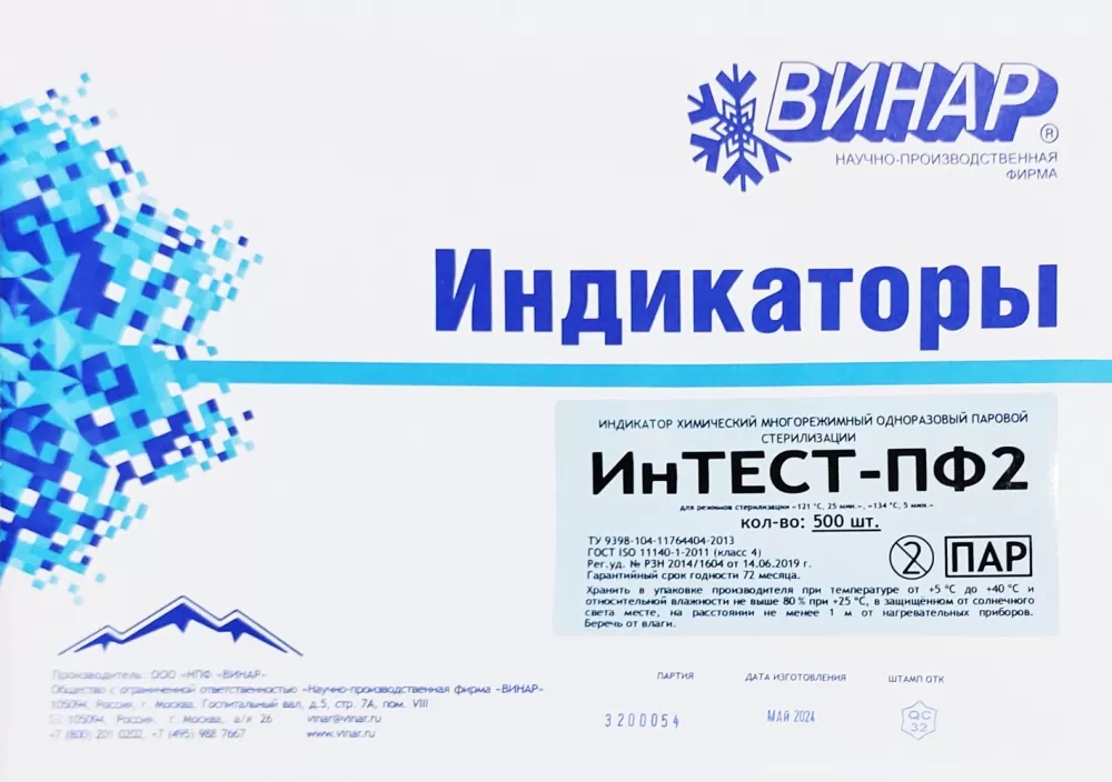 Индикаторы «ИнТЕСТ-ПФ» предназначены для контроля соблюдения критических переменных паровой стерилизации — температуры стерилизации, времени стерилизационной выдержки и наличия насыщенного водяного пара как внутри стерилизуемых изделий, так и в стерилизационной камере паровых форвакуумных стерилизаторов при соответствующих режимах.