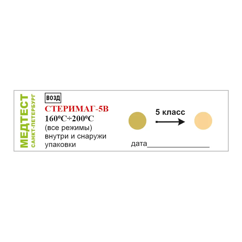 Медицинское изделие Индикатор химический для контроля процессов воздушной стерилизации, интегрирующий "СТЕРИМАГ-5В 160 С_200 С (все режимы)"; (РУ № РЗН 2019/8847 от 30.08.2019) соответствует классу 5 по ГОСТ ISO 11140-1-2011.