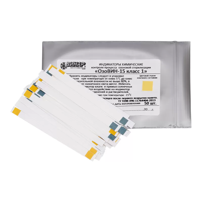 Полоски индикаторные «ОзоВИН-15», выпускаемые в двух модификациях «ОзоВИН-15 класс 1» и «ОзоВИН-15 класс 4» предназначены для визуального контроля соблюдения параметров режима в ходе цикла газовой стерилизации в атмосфере озона, проводимого в камере озонового стерилизатора СО-01-СПБ, производства ЗАО «МЭЛП».