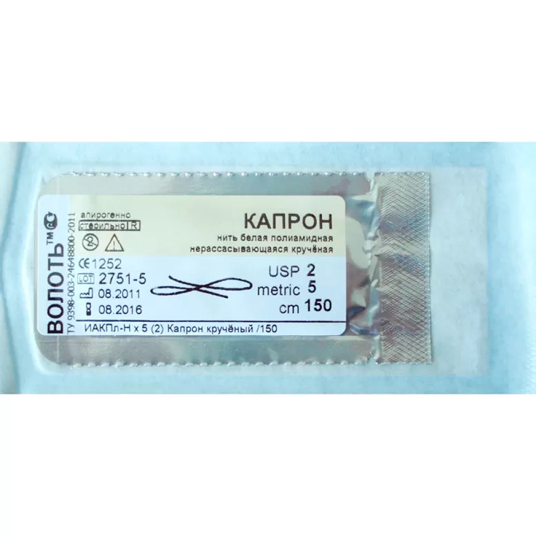Капрон – это синтетический условно нерассасывающийся (биодерградация происходит в течение 1-2 лет) шовный материал. Нити капрона биологически инертны, непирогенны, вызывают минимальную реакцию тканей. Химический состав нити Капрон: модифицированный полиамид. Нити капрона проходят радиационную стерилизацию.