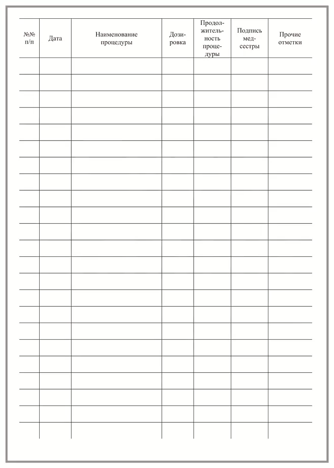 Карта больного заводится в единственном экземпляре и содержит сведения о всех видах назначенных процедур, в том числе и тех, которые проводятся на дому. Данные о назначенных процедурах размещаются в таблице.