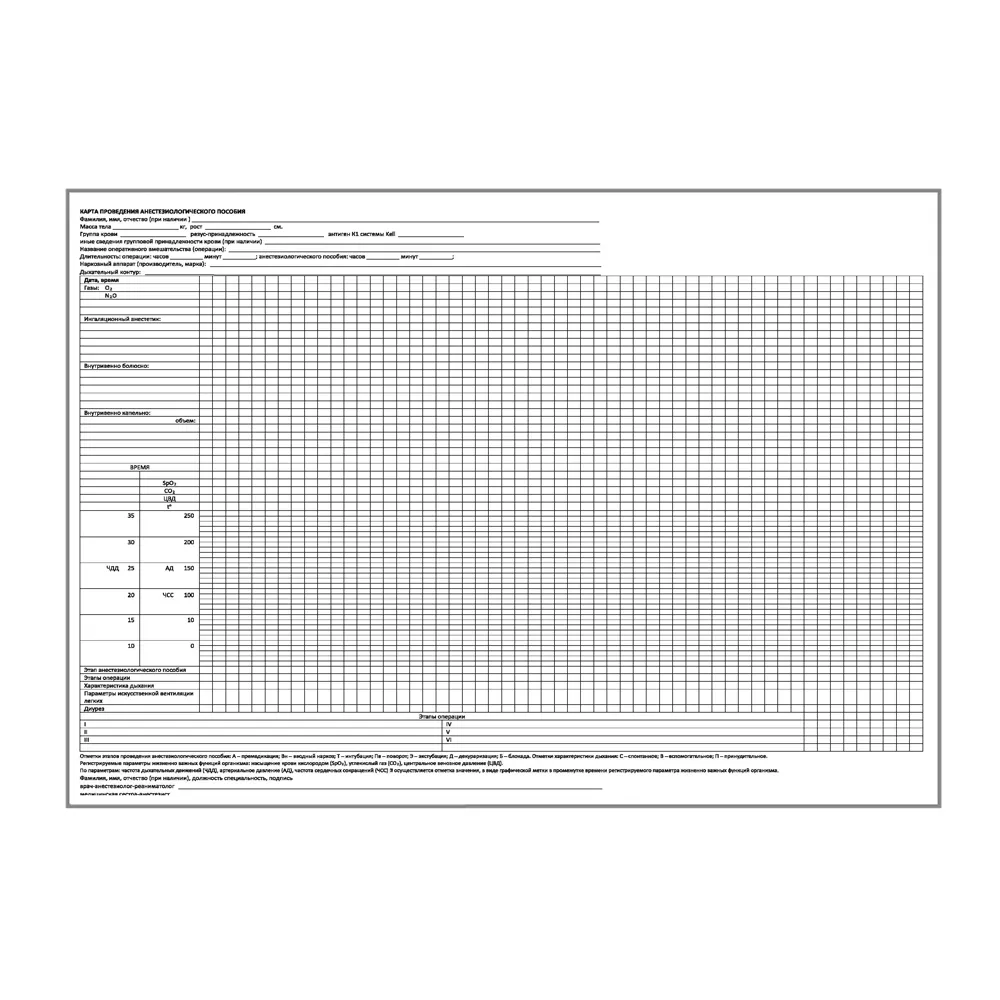 Карта проведения анестезиологического пособия, формат А3 (Приказ Минздрава РФ от 05.08.2022 № 530Н "Об утверждении унифицированных форм медицинской документации, используемых в медицинских организациях, оказывающих медицинскую помощь в стационарных условиях, в условиях дневного стационара и порядков их ведения").