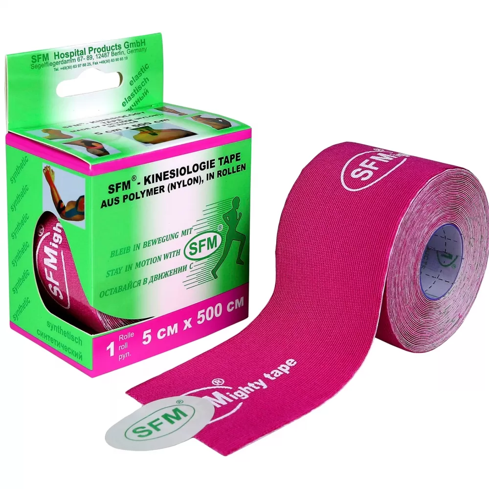 - Лейкопластырь кинезио тейп SFM 5 см Х 500 см, розового цвета представляет собой эластичную хлопковую ленту на клейкой гипоаллергенной основе.
