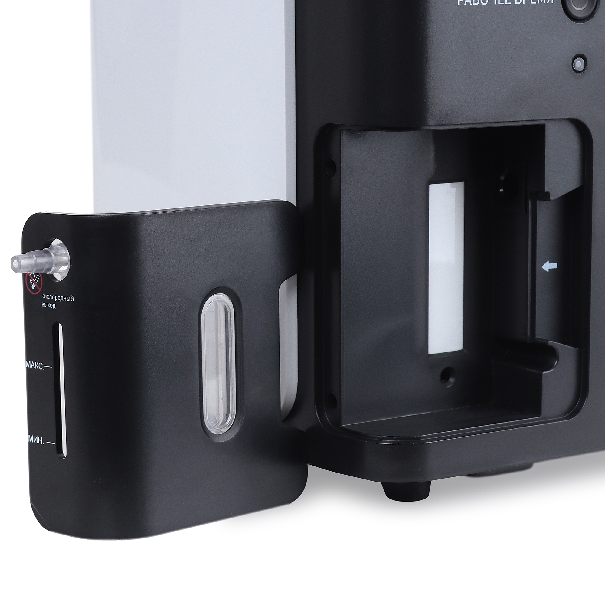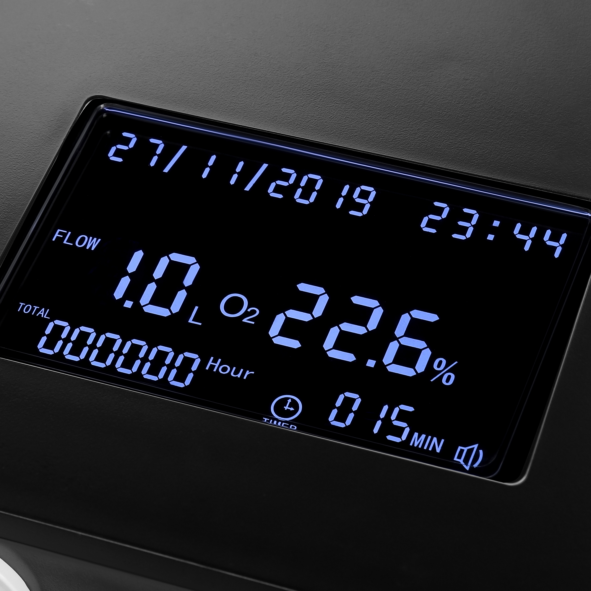- ЖК-дисплей с отображением текущей концентрации кислорода, скорости потока, времени сеанса, индикацией низкого уровня кислорода и активных функций.