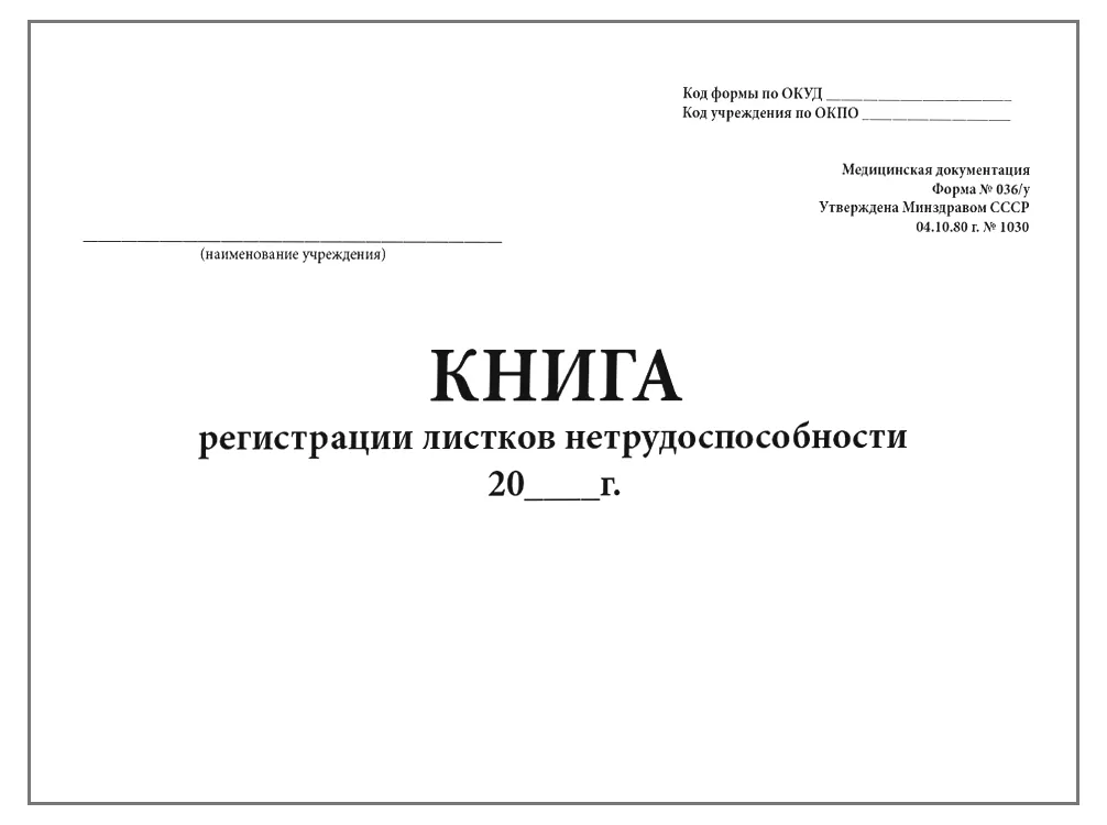 Выдача листков временной нетрудоспособности фиксируется в Книге регистрации листков временной нетрудоспособности (форма № 036 у), которая должна быть прошнурована, пронумерована, заверена круглой печатью учреждения и подписью руководителя лечебного учреждения.