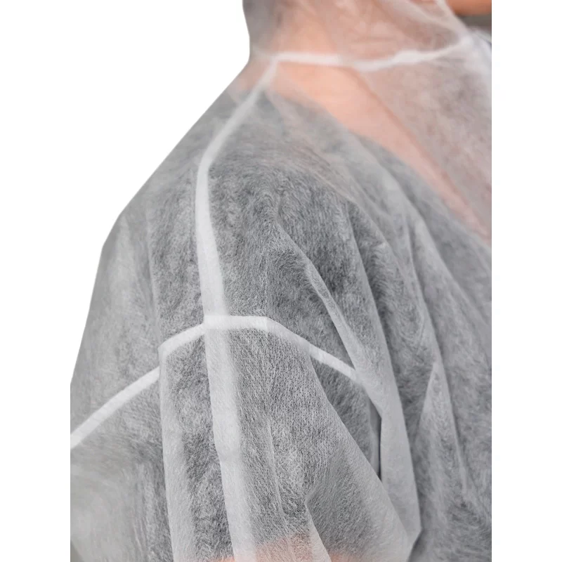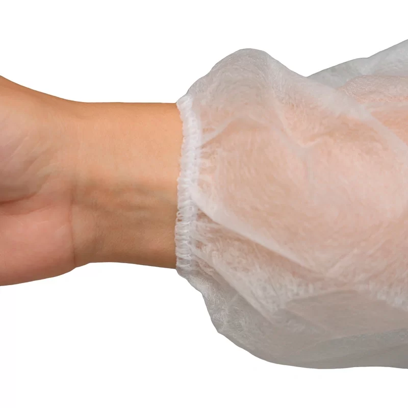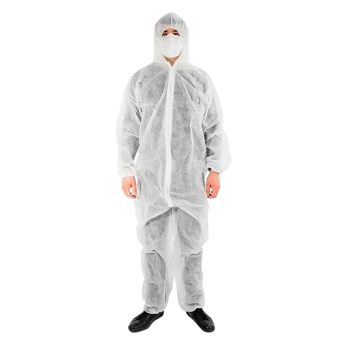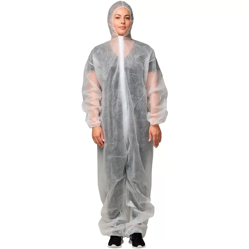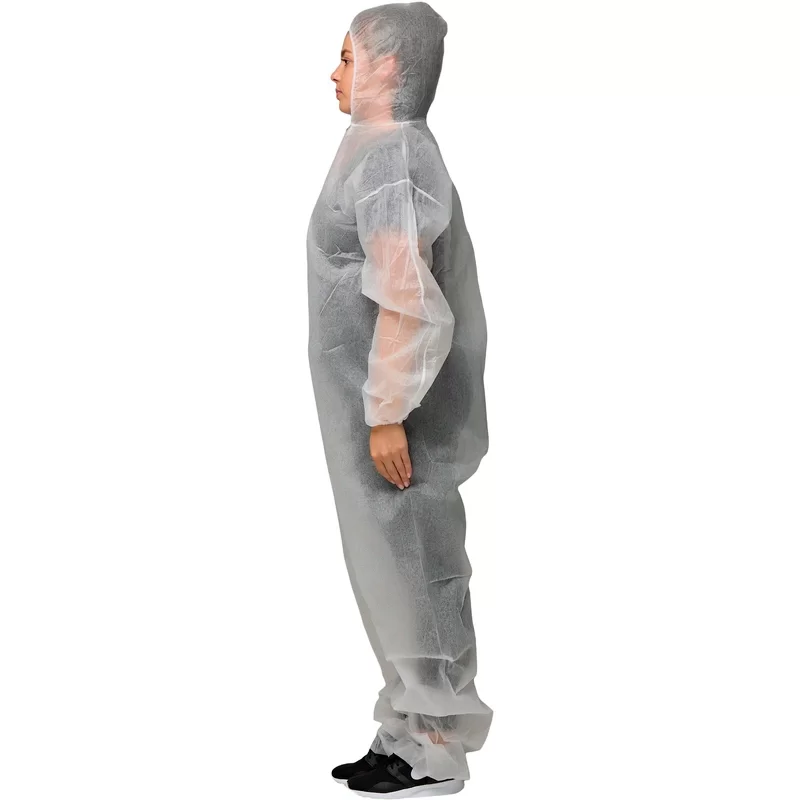 - Одноразовый комбинезон сшит с использованием утягивающих резинок на запястье, нижней части брюк и на капюшоне, оснащен застежкой-молнией.