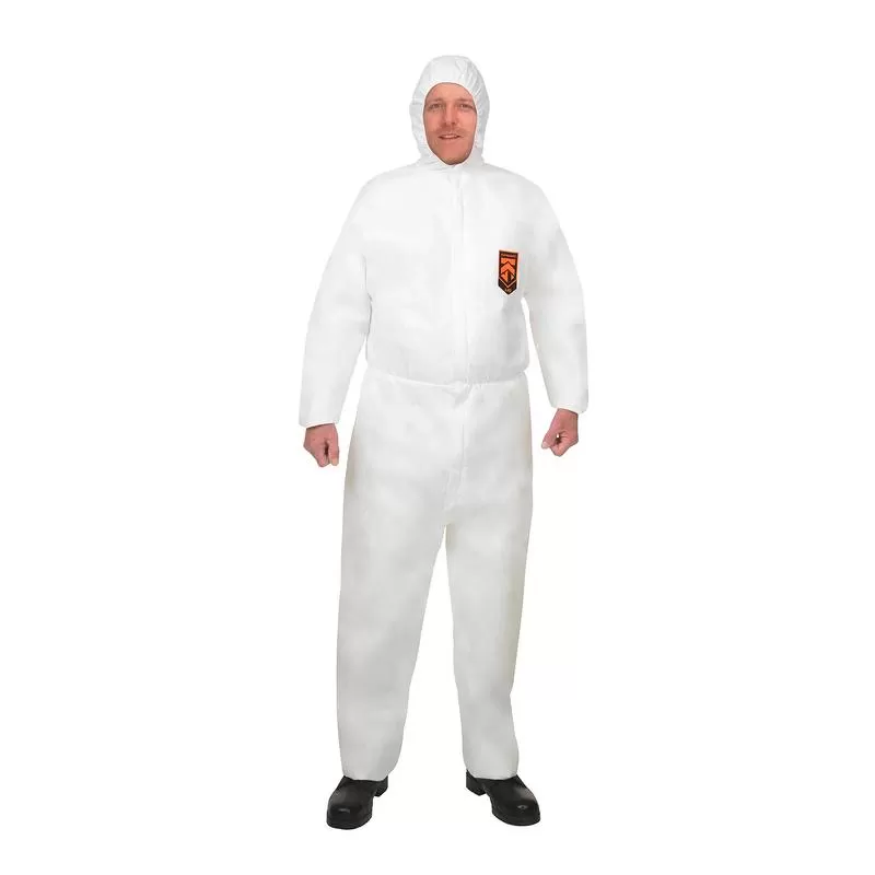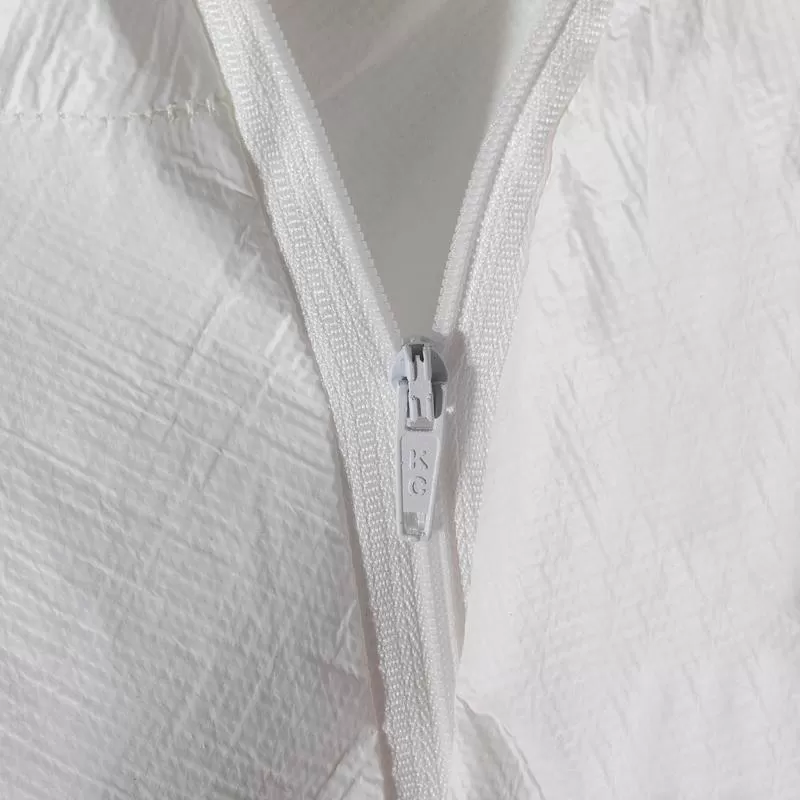 - Одноразовый комбинезон Kleenguard A 40 с капюшоном белого цвета для защиты от проникновения брызг и частиц, в т. ч. и химического происхождения.