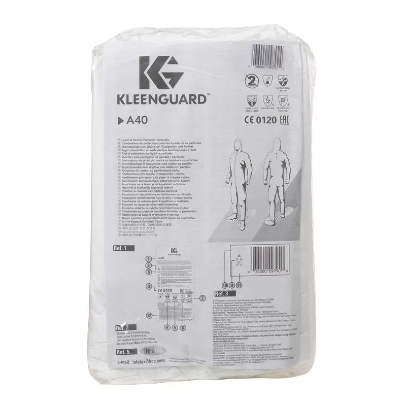 - Kleenguard A 40 обеспечивает комплексную защиту от разных видов опасностей: тип 5 (EN 13882–1) — защите от опасных сухих веществ, тип 6 (EN 13034) — защита от небольших брызг растворов химических веществ, легких брызг неопасных жидкостей.