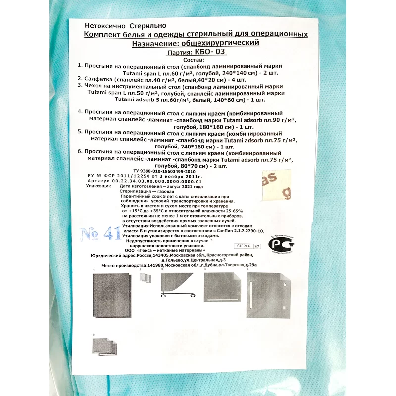 - Стерильный комплект белья и одежды предназначен для длительных операций на брюшной полости с большим количеством отделяемых жидкостей.