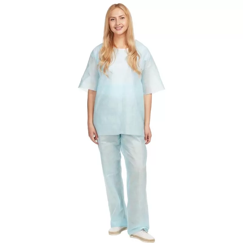 Одноразовый хирургический костюм (рубашка и брюки) изготовлен из спанбонда, воздухопроницаемого материала с антимикробными свойствами, устойчивого к воздействию влаги и статического электричества. Костюм для хирурга мягкий, легко драпируется, комфортен при ношении.