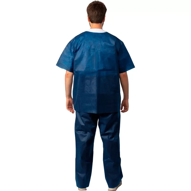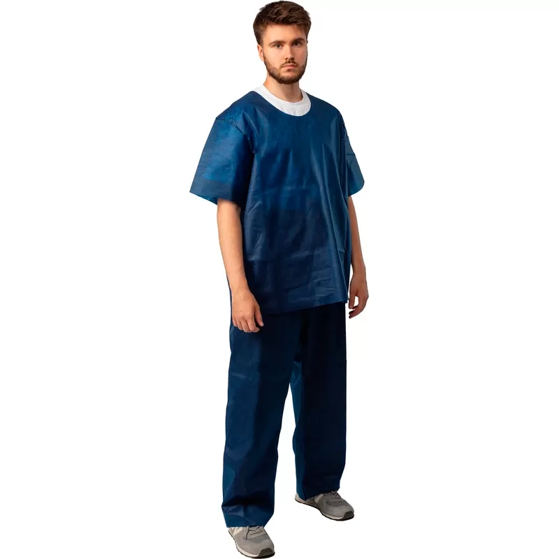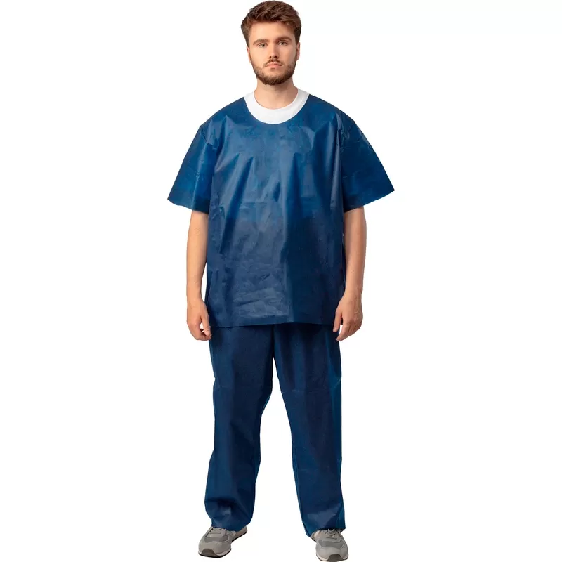 - Костюм состоит из рубашки и брюк. Рубашка прямого силуэта, без застежки, рукав короткий.