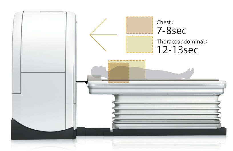 Апертура пациента 80 см является самой большой для диагностических КТ, что позволило использовать стол с самой широкой верхней подвижная частью стола 47,5 см с возможностью поперечного перемещения +/- 10 см, что также является уникальной функцией для компьютерных томографов.