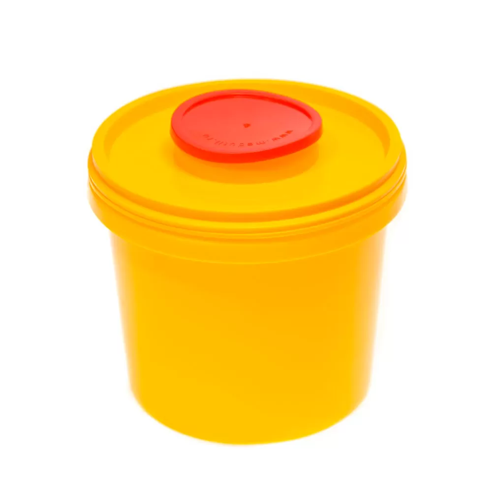 Ёмкость-контейнер класс Б для сбора игл с основанием и верхом круглой формы. Объём 1 литр.