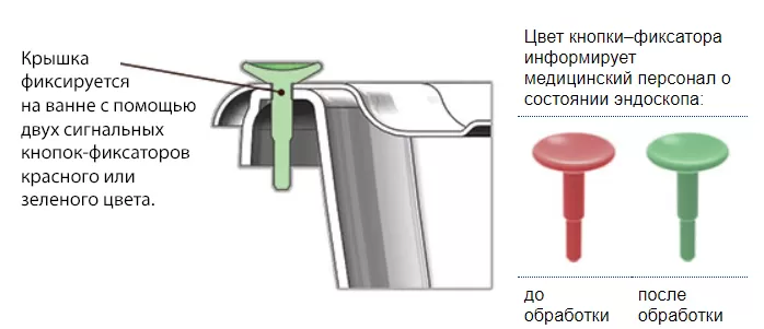 - Идентификация контейнеров - Зеленая кнопка-фиксатор для идентификации контейнера с эндоскопом, прошедшим обработку; красная кнопка-фиксатор для контейнера c эндоскопом до обработки (после использования). Красных кнопок - 4 шт, зеленых кнопок - 4 шт.