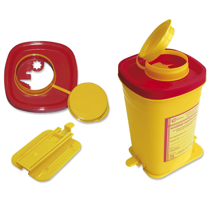 Контейнер, в форме усеченного конуса, из непрокалываемого пластика, устойчивого к действию дезинфицирующих средств. Крышка контейнера, красного цвета, со специальными профилями для бесконтактного съема игл, обеспечивает герметизацию. Рабочий клапан контейнера, желтого цвета, после окончательного закрытия, невозможно вскрыть, благодаря специальной системе рисок. Обязательное наличие этикетки с указанием кода подразделения, названия ЛПУ, даты сбора и ответственного за сбор отходов. Контейнер имеет возможность закрепления на поверхности стола, при помощи специального крепления.