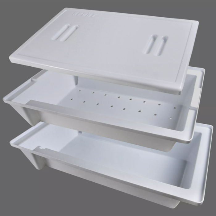Контейнер КДС-20-"КРОНТ" предназначен для предстерилизационной очистки, химической дезинфекции и стерилизации медицинских изделий (габаритные хирургические инструменты, наркозо-дыхательная аппаратура, предметы ухода за больными, лабораторная посуда и т.п.). Контейнер представляет собой ванну с крышкой, внутри которой расположен перфорированный поддон.