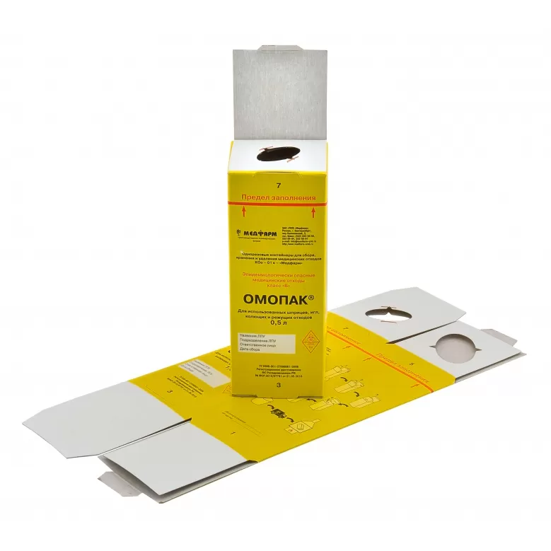 Контейнеры изготовлены из многослойного влагостойкого прессованного картона «ОМОПАК». Картонные контейнеры предназначены для сбора медицинских отходов классов «Б» и применяются в организациях, осуществляющих медицинскую деятельность, в том числе микробиологических, паразитологических, клинико-диагностических лабораториях, различных отделениях стационаров, процедурных, хирургических, прививочных кабинетах, в машинах скорой медицинской помощи, косметологических, парикмахерских салонах и т. п., а также ветеринарных клиниках. Сбор жидких отходов в контейнеры «ОМОПАК» не производится.