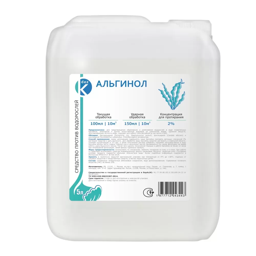 Препарат Альгинол от компании Континент предназначен для быстрого и эффективного предотвращения роста водорослей в воде аквапарков и плавательных бассейнов на долгое время, также удаляет вещества, которые вызывают мутность воды, а благодаря отсутствию пенообразования, подходит для любых типов бассейнов и SPA. Состав: четвертичные полимерные аммониевые соединения, деионизированная вода (содержание основного вещества не менее 10%).