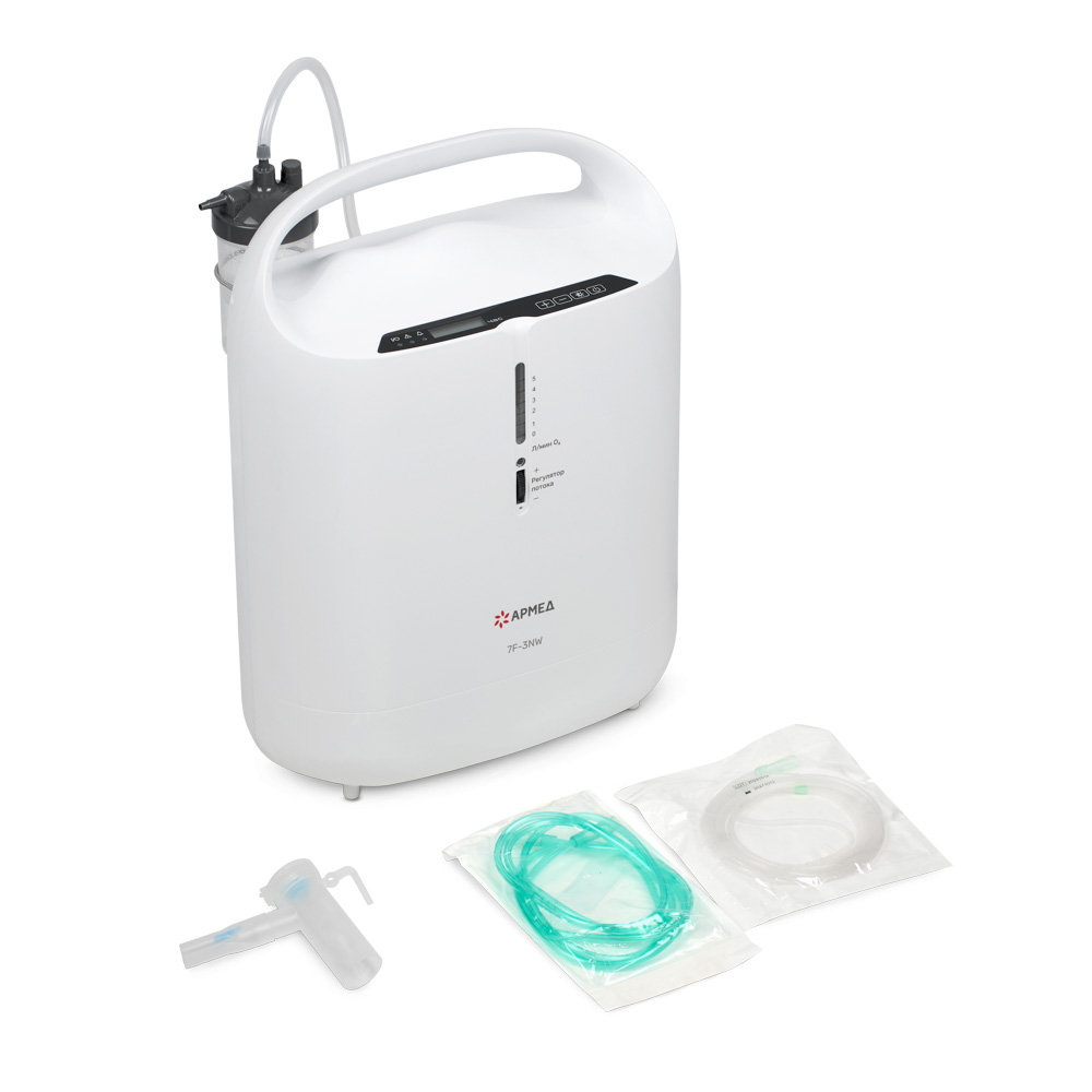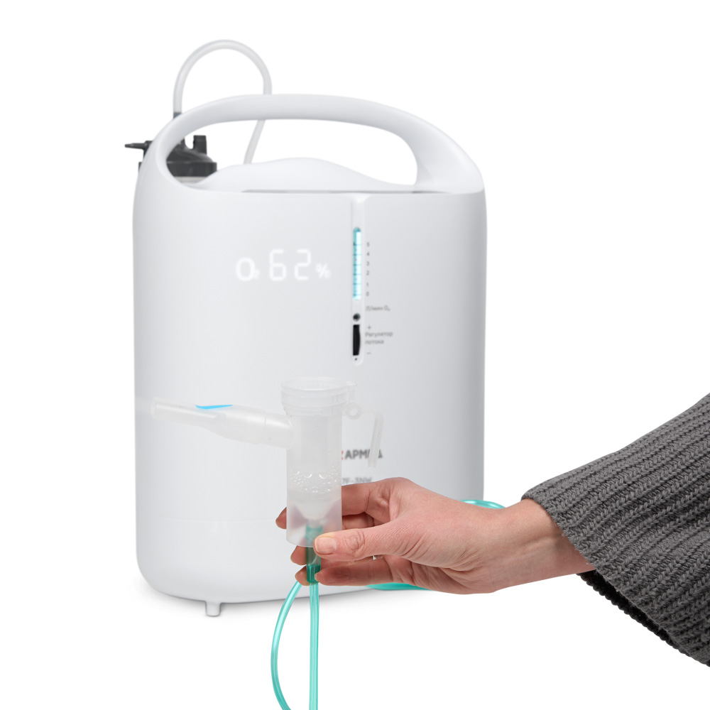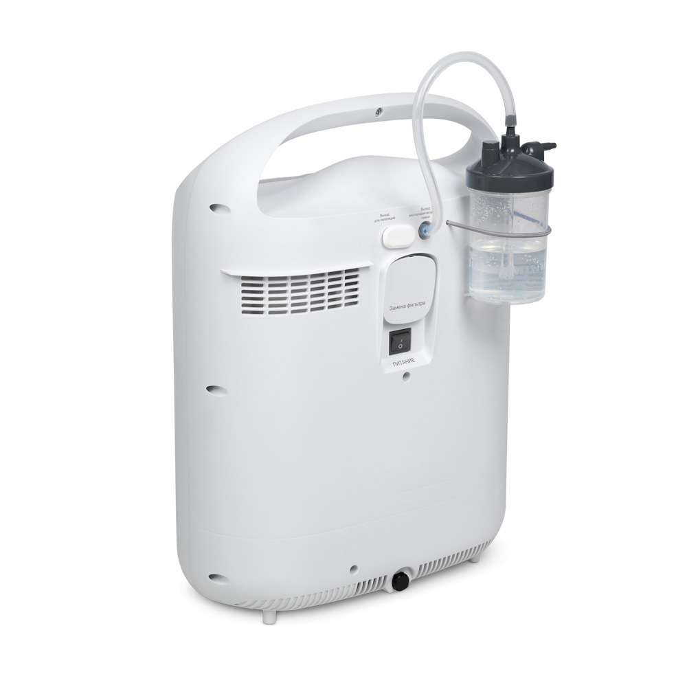 Переносной концентратор кислорода с продуманной конструкцией и оригинальным внешним видом. Достаточно мощная, но простая в использовании модель с выходом для ингаляций и информативной подсветкой данных о текущей концентрации кислородно-воздушной смеси на выходе. Подходит для использования дома, в небольших медицинских учреждениях и оздоровительных центрах.