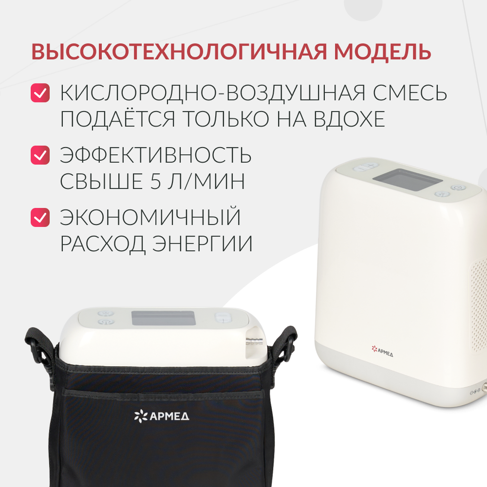 Современный импульсный концентратор кислорода, в котором подача кислородно-воздушной смеси пользователю происходит только при вдохе. По сравнению с приборами с непрерывной подачей эта высокотехнологичная модель отличается значительно более высокой эффективностью, экономичным энергопотреблением и портативностью. Благодаря автономной работе и относительной компактности этот прибор можно брать с собой и использовать там, где необходимо, даже в дороге.