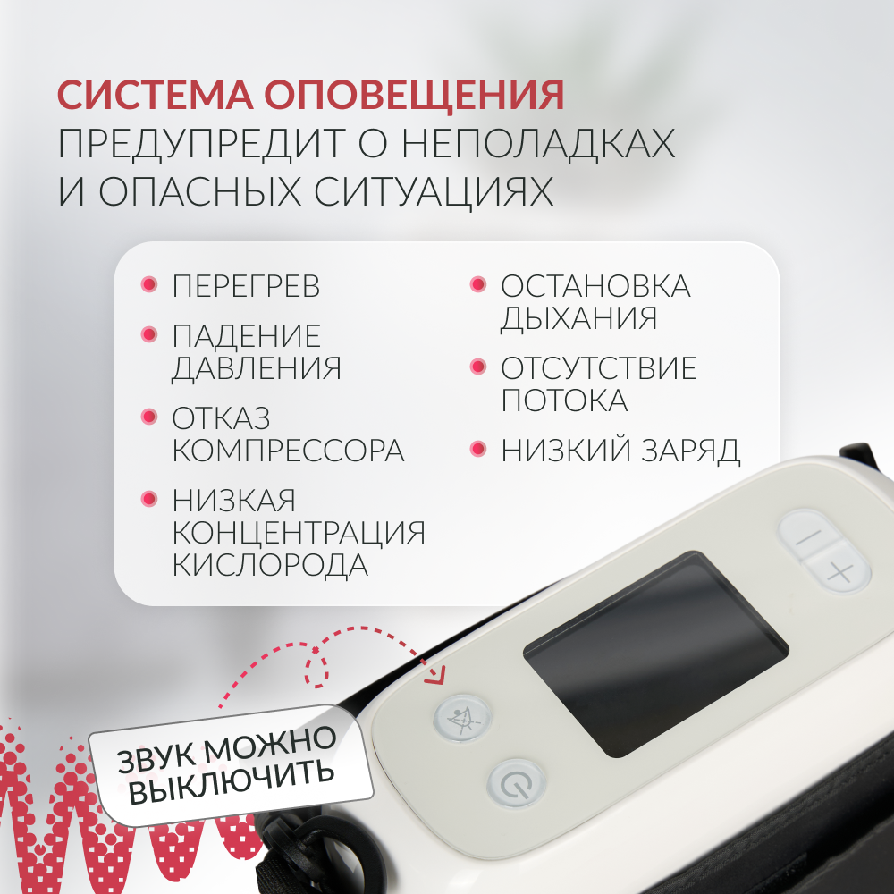Подача кислорода только на вдохе; Не требуется увлажнитель; Встроенная АКБ; Переносная модель; Эффективность свыше 5 л/мин