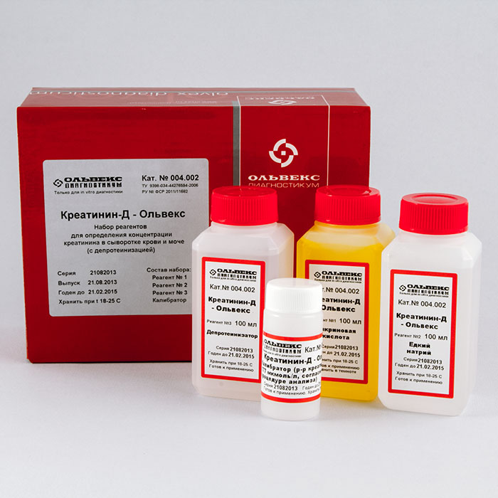 Набор реагентов «Креатинин-Д-Ольвекс» предназначен для количественного определения содержания креатинина в сыворотке крови и моче человека методом на основе реакции Яффе с депротеинизацией. Набор рассчитан на 200 определений при конечном объёме реакционной смеси 2.0 мл.
