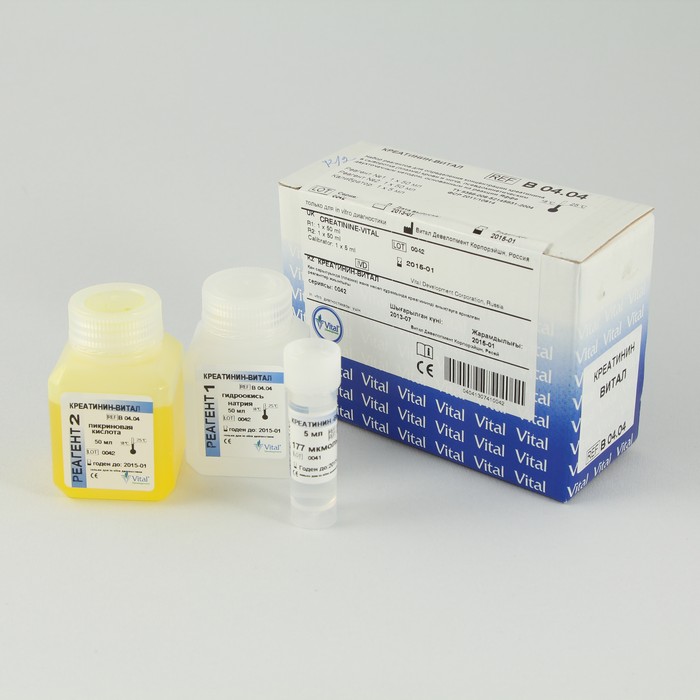 Диагностический набор КРЕАТИНИН-ВИТАЛ (В 04.04) для количественного определения содержания креатинина в сыворотке, плазме крови или моче двухточечным (псевдокинетическим) методом.