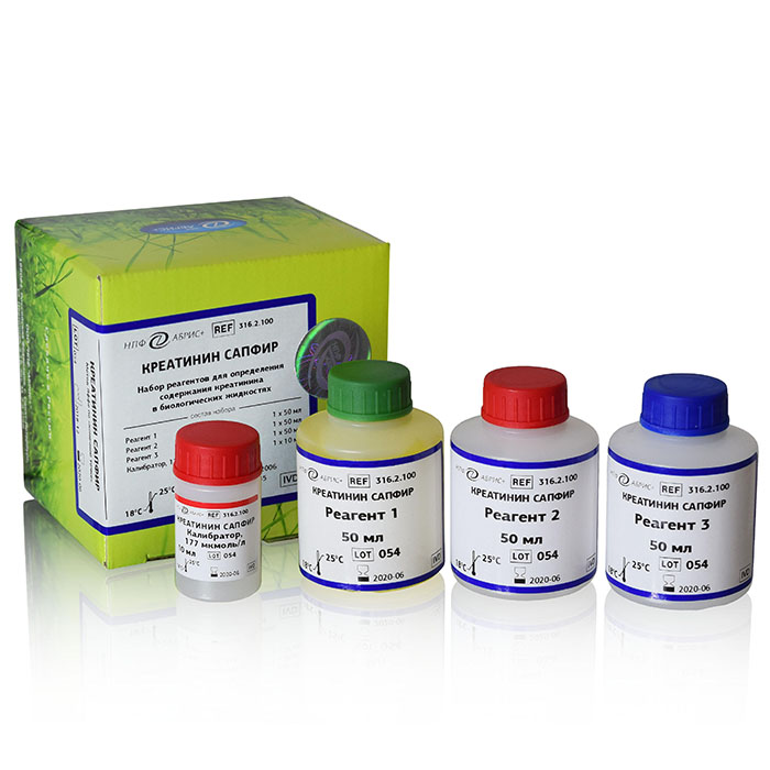 Набор реагентов для определения содержания креатинина в биологических жидкостях методом Яффе с депротеинизацией.