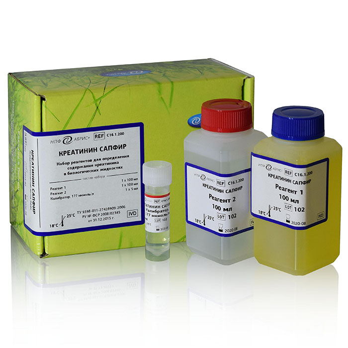 Набор реагентов для определения содержания креатинина псевдокинетическим методом Яффе без депротеинизации.