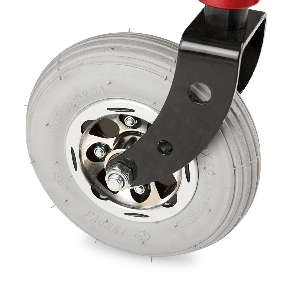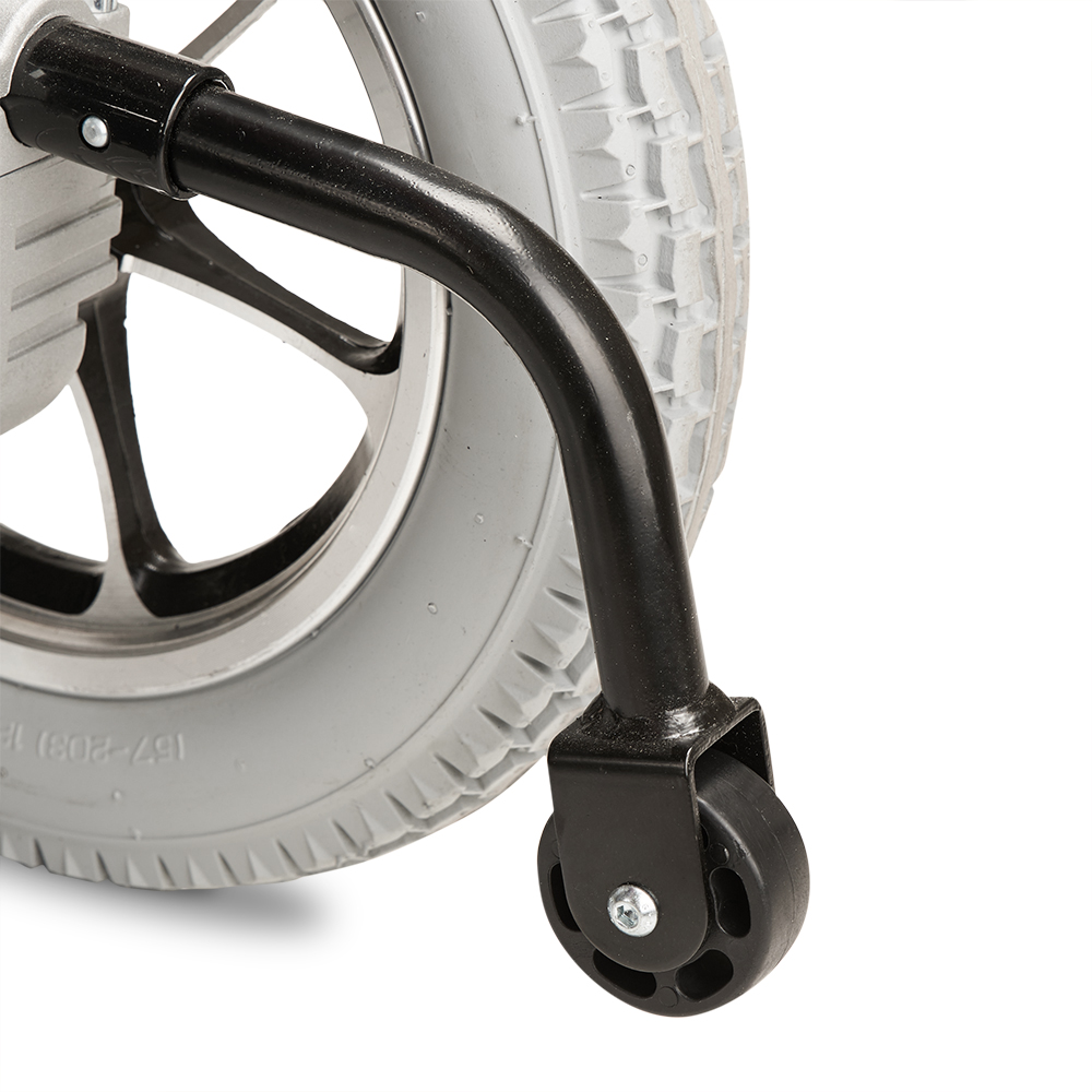 Общая ширина коляски (всего 58 см) позволяет человеку без труда проезжать в узких коридорах. Передние и задние пневматические колеса обеспечивают мягкое, гладкое скольжение на неровных поверхностях.