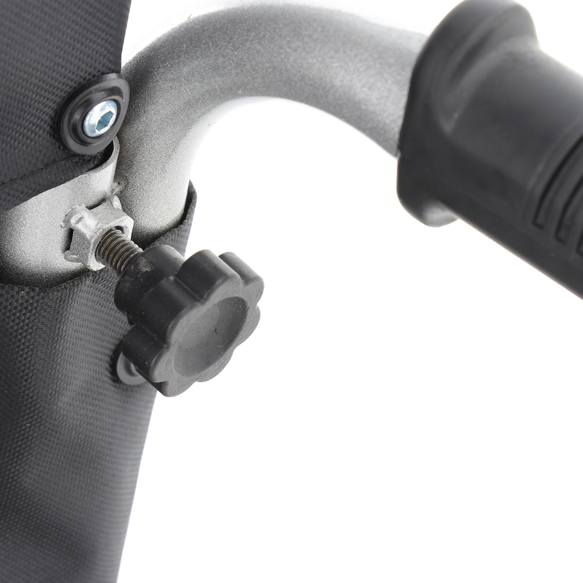 - Рама: Складная (по ширине), ножничного типа, стальная с полимерно-порошковым покрытием, с быстросъемными антиопрокидывателями и складными (вниз) ручками для передвижения кресла-коляски вручную сопр. лицом