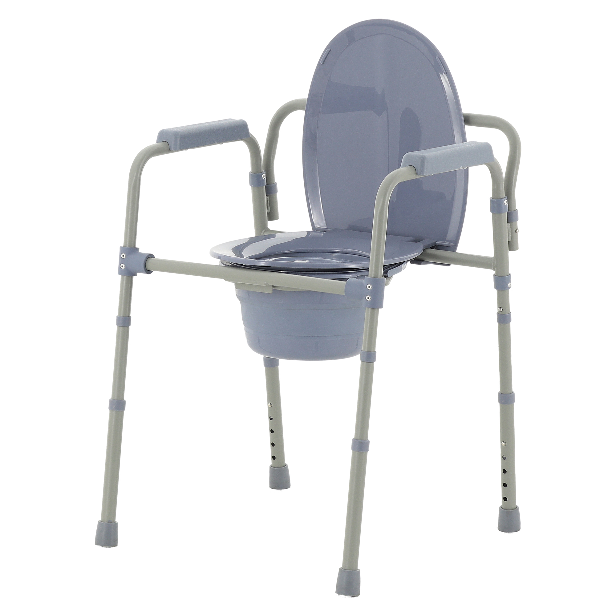 Каркас изготовлен из стальных труб (_ 22 мм) с полимерно-порошковым покрытием, устойчивым к коррозии и дезинфекции. Конструкция быстросборная, без применения инструментов, с разъёмной передней поперечиной и клип-фиксаторами для надёжности. Телескопические ножки (_ 22/25,5 мм) регулируются по высоте (40–50 см, 5 положений, шаг 2,5 см) и оснащены нескользящими наконечниками из термопластичной резины с металлической шайбой. Съёмное сиденье и откидная крышка из высокопрочного пластика (толщина 9 мм/6 мм) с гигиеническим вырезом (20x24,5 см) фиксируются кронштейнами-зажимами. Туалетное судно (_ 26,5x15,5 см) легко извлекается и складывается для хранения (32,5x31,5x6,5 см). Подлокотники с пластиковыми поручнями (21x5x3,5 см) и съёмная спинка (22x53 см) повышают комфорт. Габариты (51–53x55,5x62,5–72,5 см), масса (5,8 кг) и складывание до 54x15x35 см обеспечивают удобство использования и хранения.