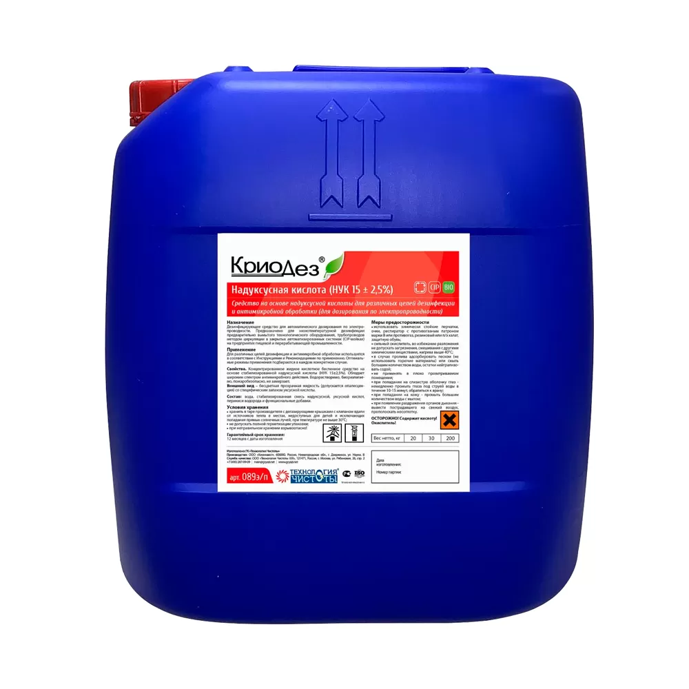 - Состав: Вода, стабилизированная смесь надуксусной, уксусной кислот, перекиси водорода, функциональные добавки. В качестве действующих веществ (ДВ) содержит перекись водорода (ПВ) – (18,0 ± 3,5%) и надуксусную кислоту (НУК) (15,0 ± 2,5)%.