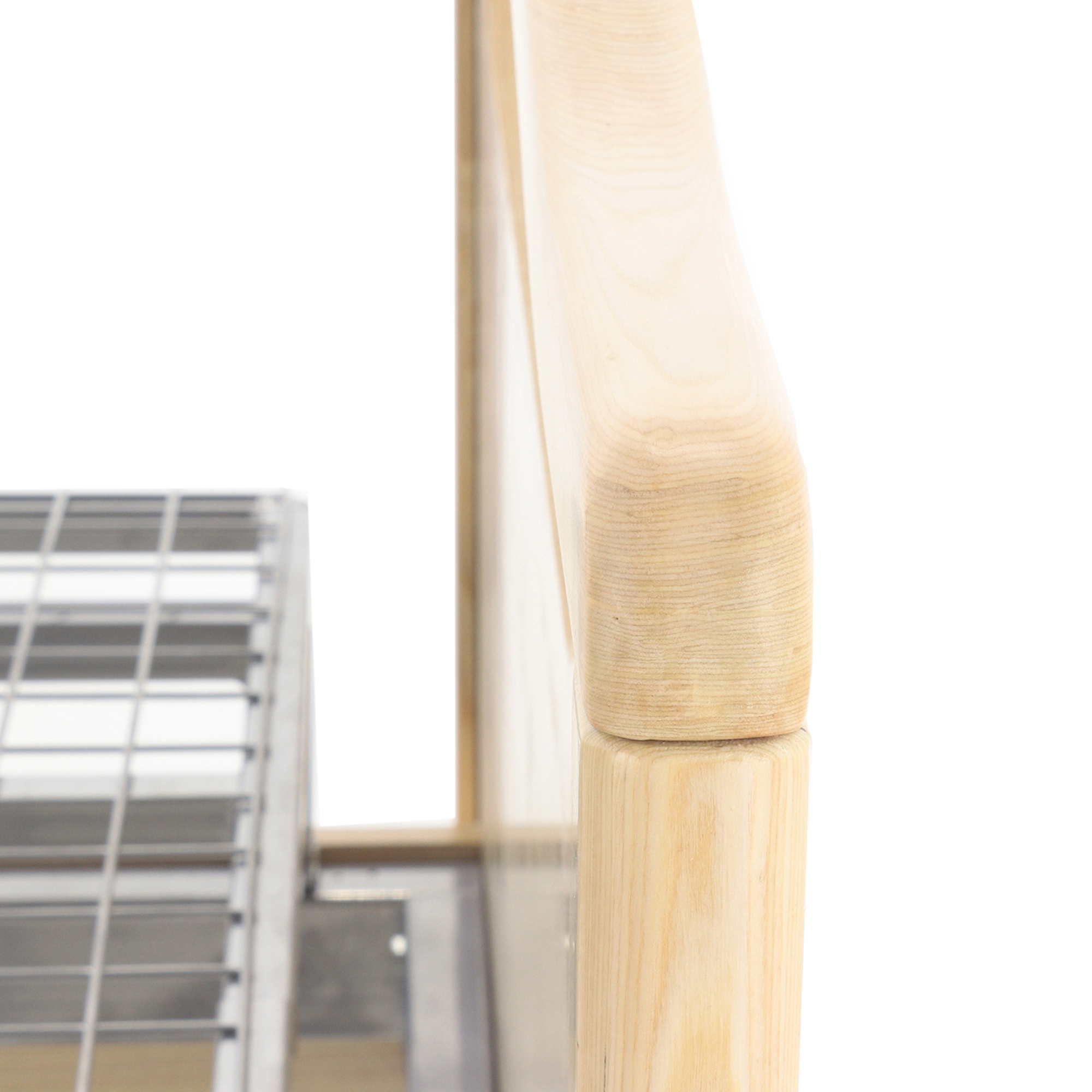 - Два быстросъёмных металлических ограждения с деревянными поручнями надёжно фиксируются в рабочем положении.