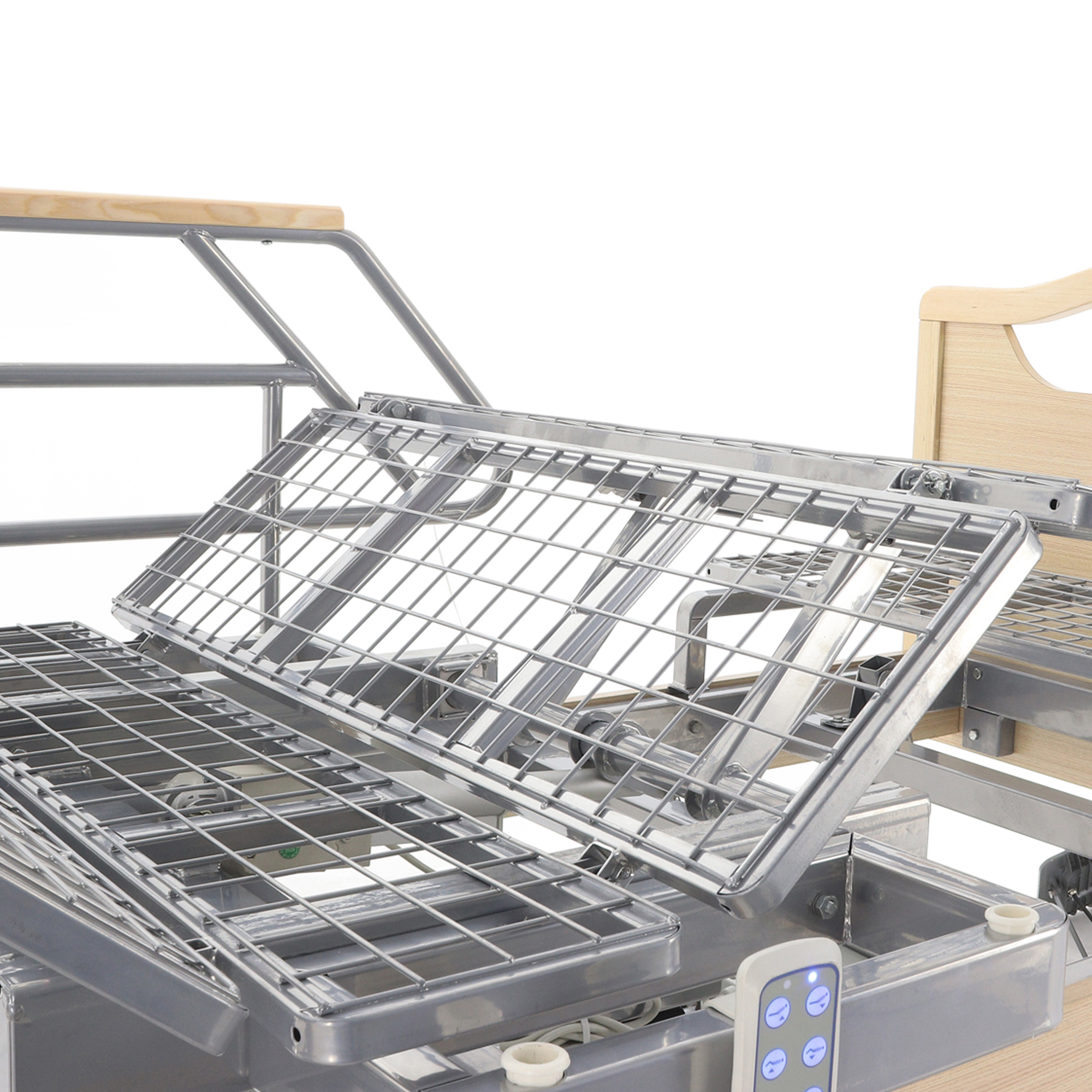 - Отдельные линейные актуаторы отвечают за регулировку секции спины, бедер, ножной части, высоты ложа и наклона (Тренделенбург/Антитренделенбург).
