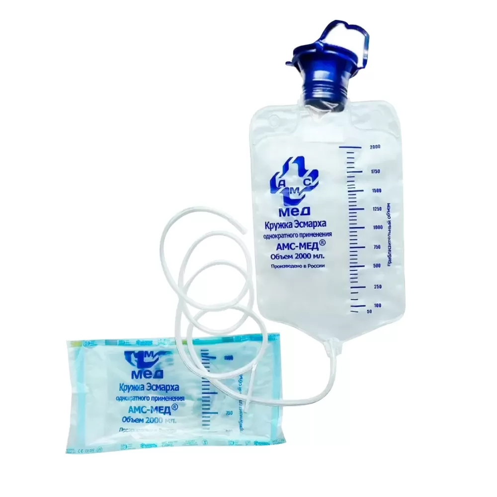 - Кружка Эсмарха одноразовая имеет два отверстия для подвешивания на стойке.