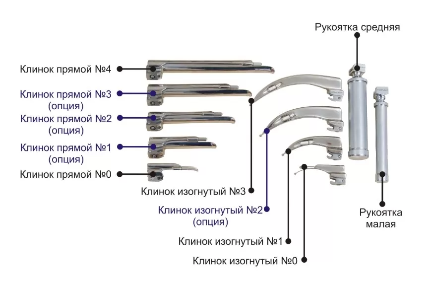 Различные размеры и типы клинков позволяют интубировать пациентов с разными анатомическими размерами головы, лица и верхних дыхательных путей.