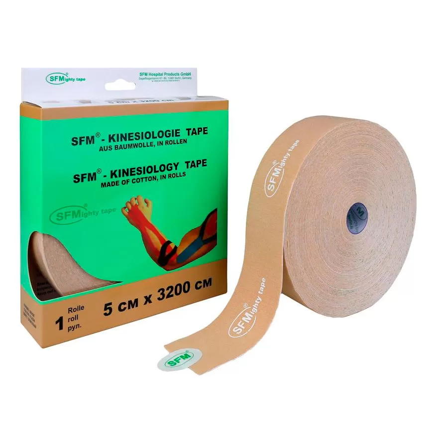 - Лейкопластырь кинезио тейп SFM, 5 см Х 3200 см, с логотипом изготовлен из хлопка с нанесением на него клейкой гипоаллергенной основы.