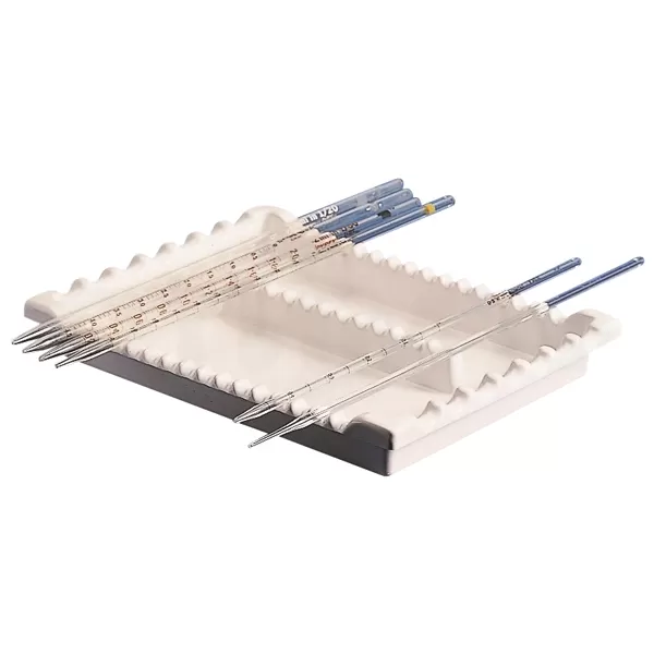 Предназначен для размещения на нем пипеток различного размера. Волнообразные гребни на бортиках лотка вмещают горизонтально либо 7 пипеток в продольном направлении (диаметром не больше 20 мм), либо 16 пипеток в поперечном направлении (диаметром не больше 10 мм). Кроме того, гребень внутри лотка позволяет располагать пипетки под углом к горизонту для слива остатков жидкости в лоток без контаминации самой пипетки. Изготовлен из поливинилхлорида (ПВХ). Автоклавированию не подлежит.